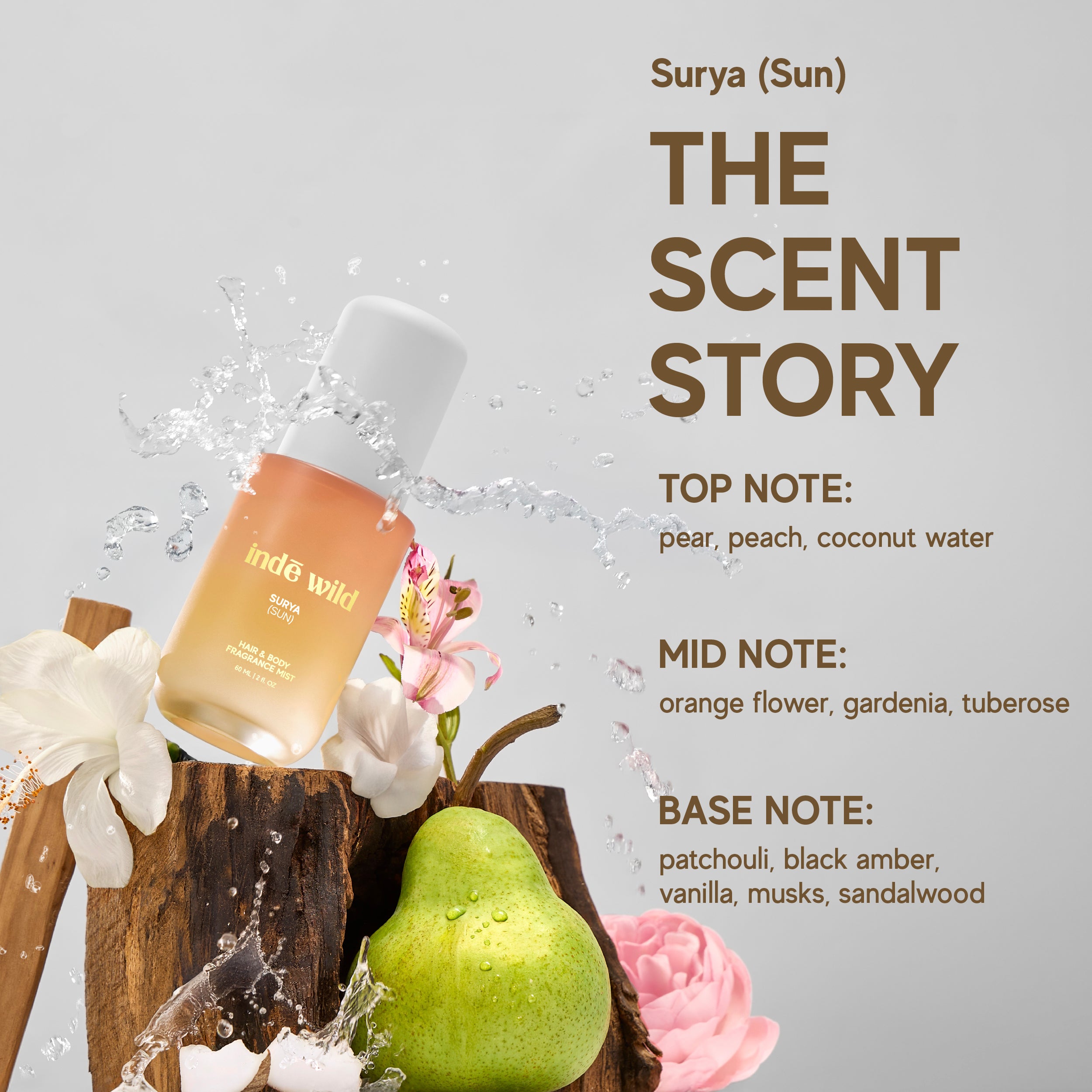 Surya (Sun): Pear, Peach, Coconut Water • Orange Flower, Gardenia, Tuberose • Vanilla, Skin Musks, Creamy Indian Sandalwood
