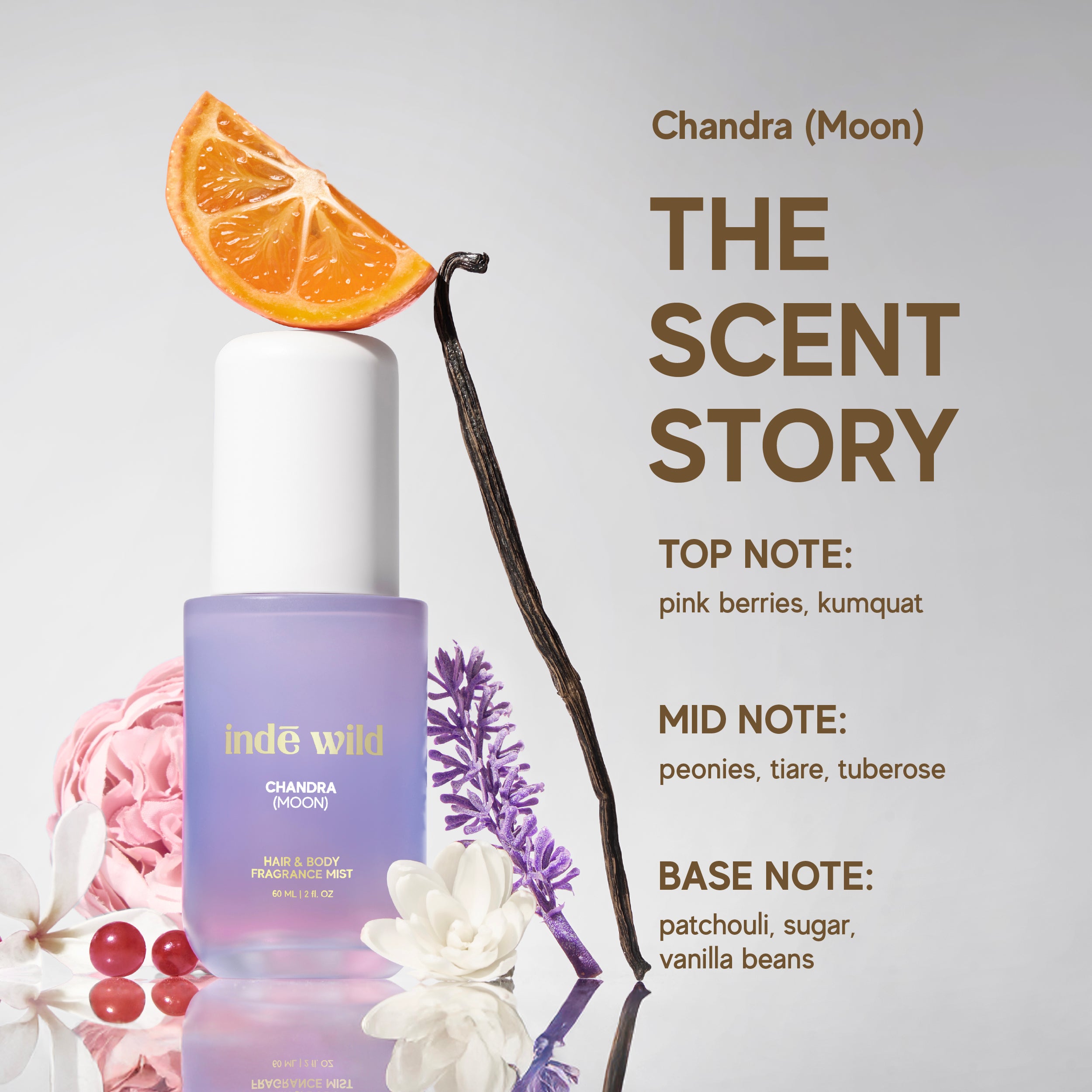 Chandra (Moon): Pink Berries, Kumquat • Peony, Tiaré, Tuberose • Patchouli, Sugar, Vanilla Beans